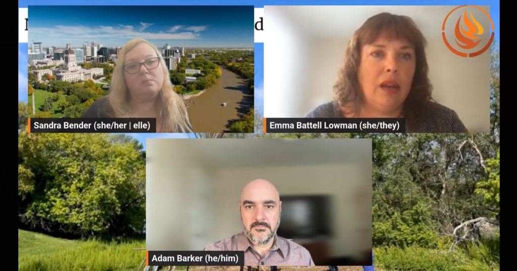 Emma Battell Lowman and Adam Barker in discussion with Sandra Bender of the National Centre for Truth and Reconciliation on what it means to be Canadian, the problems of nationalism, and being honest about our country.